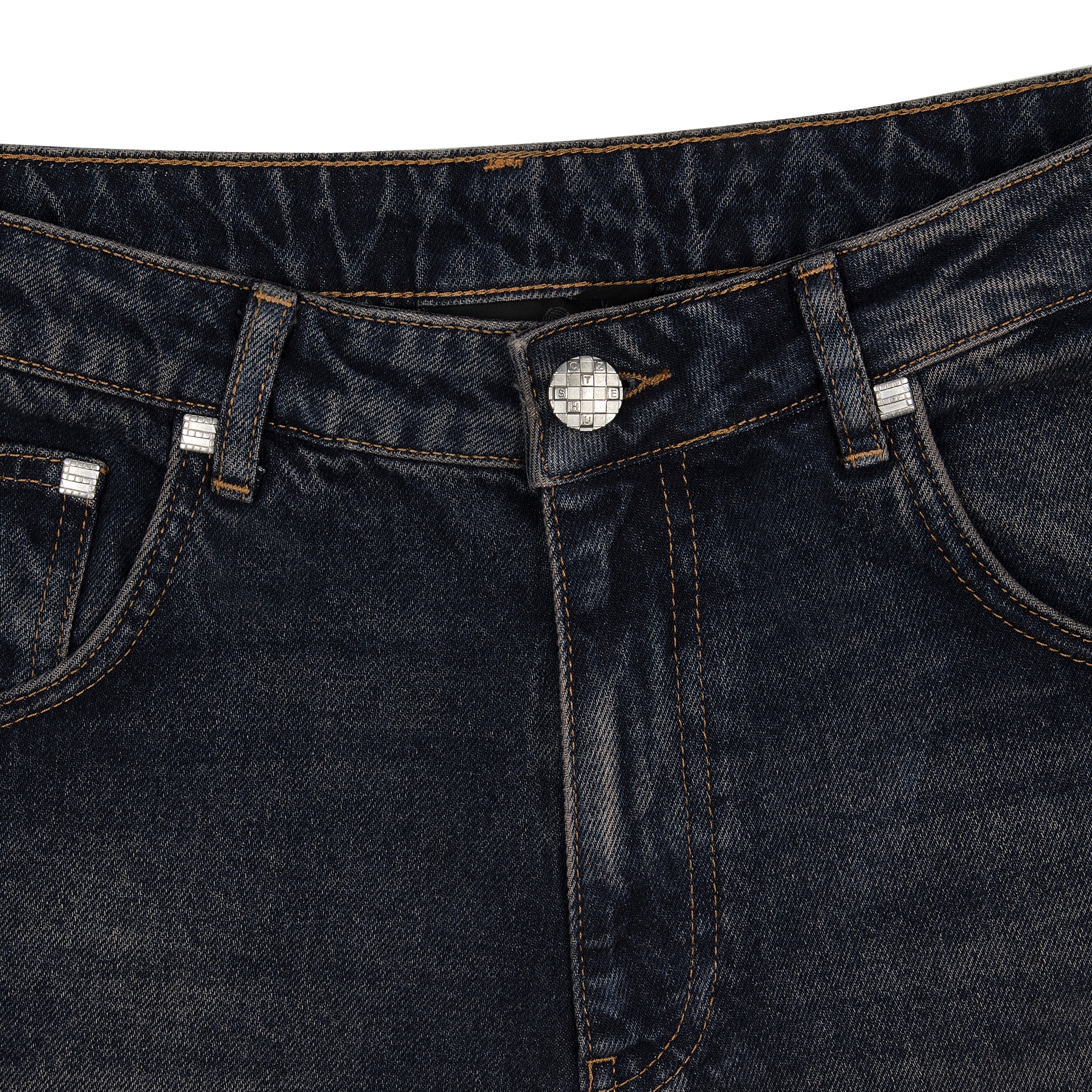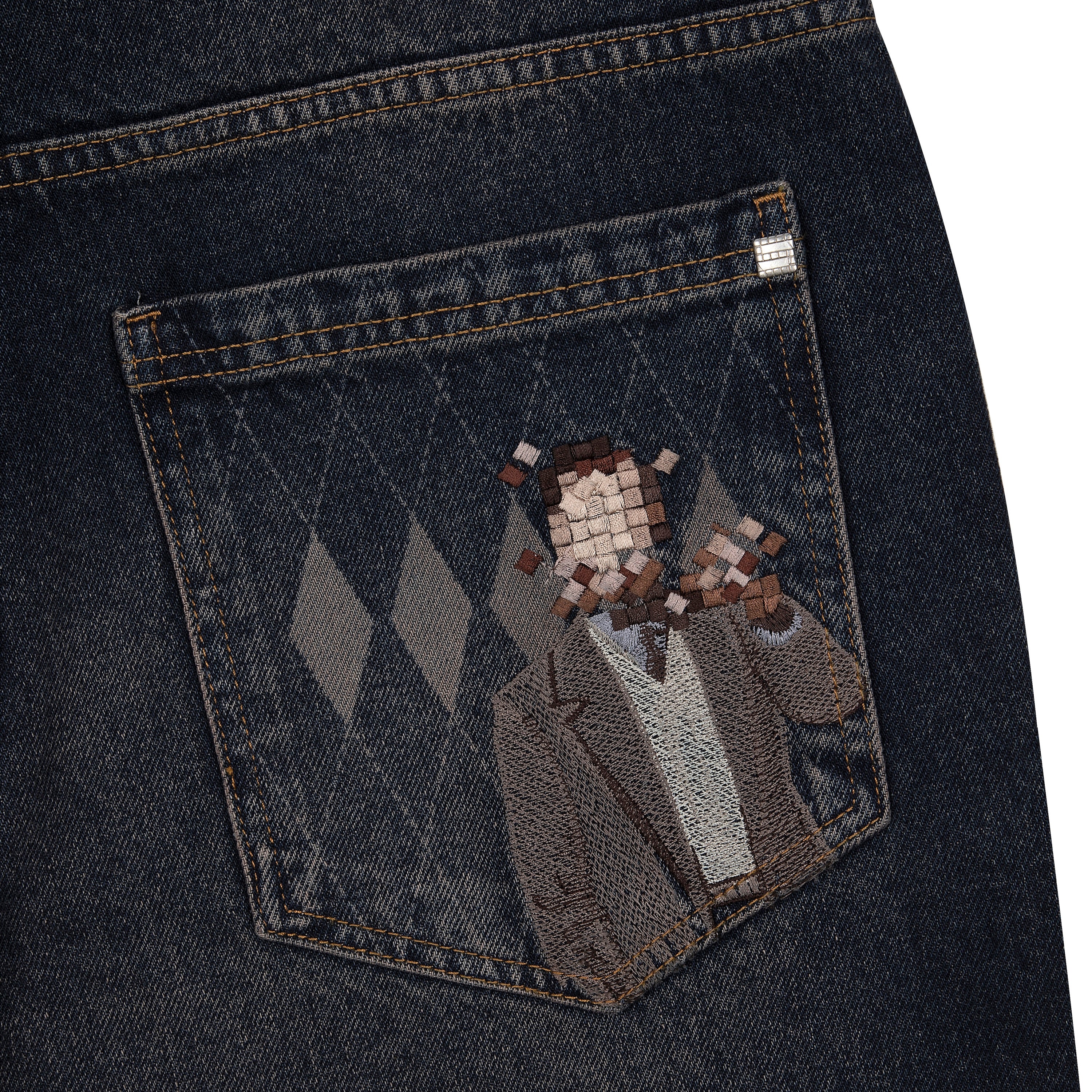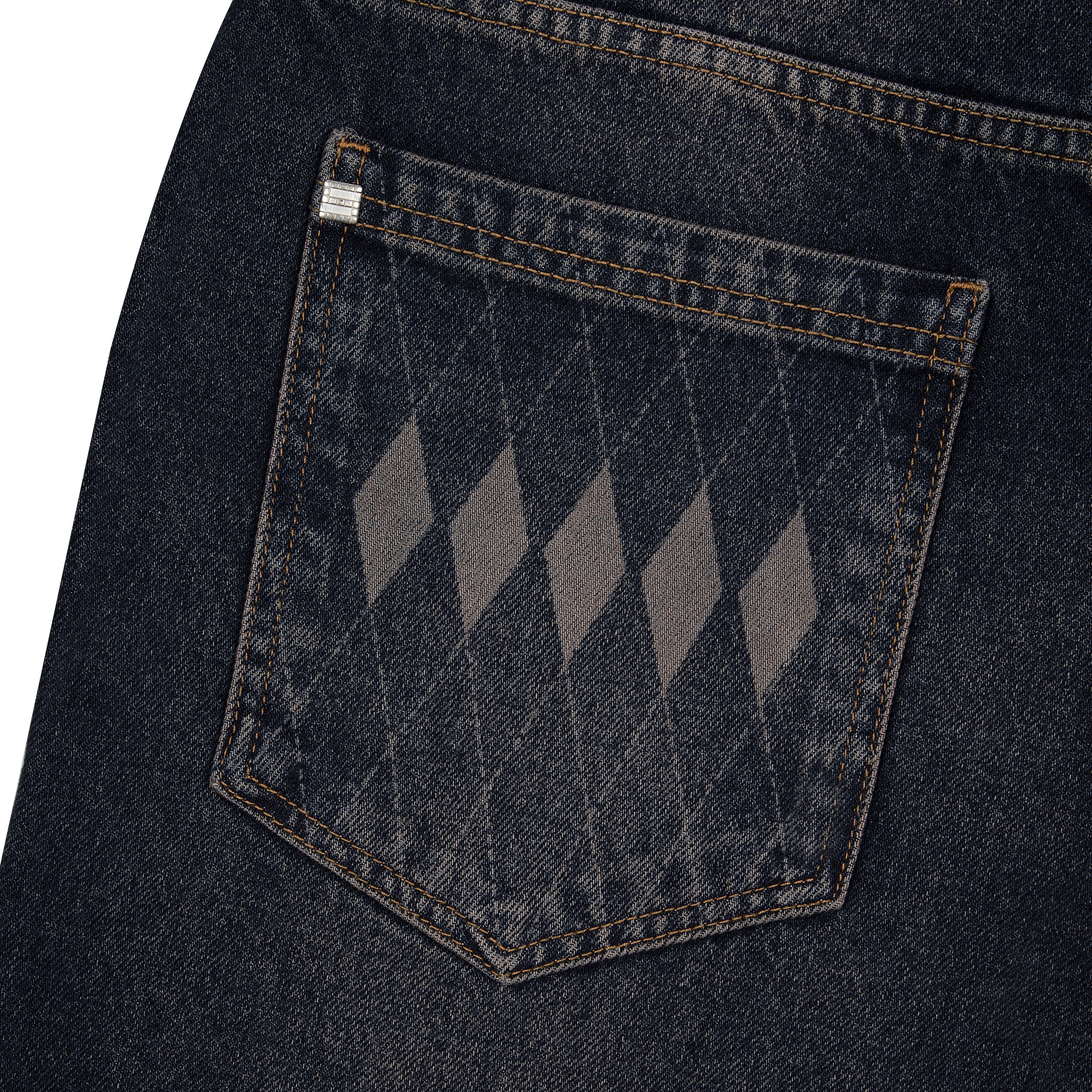 14,5oz denim / 100% cotton / laser printed plaid pattern details on front and back pockets / embroidery on back / deboss printed leather patch / effect washing / fits true to size